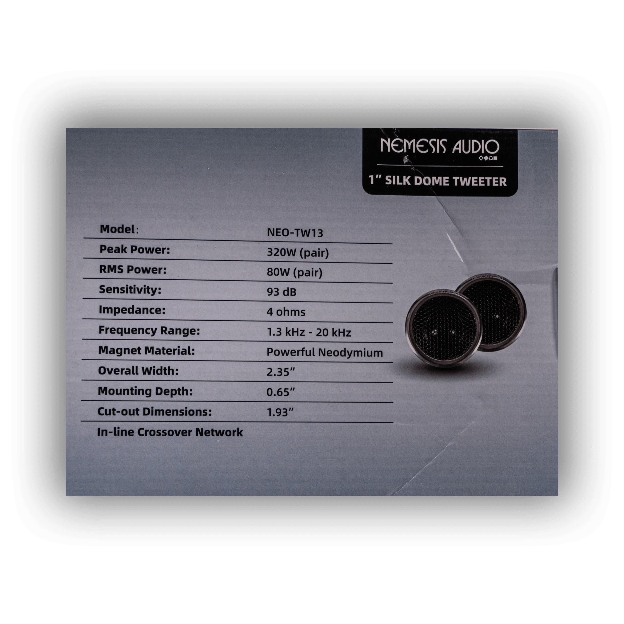 1? silk dome tweeter rated at 320W max / 80W RMS (pair) with neodymium magnet and 4?ohm impedance.